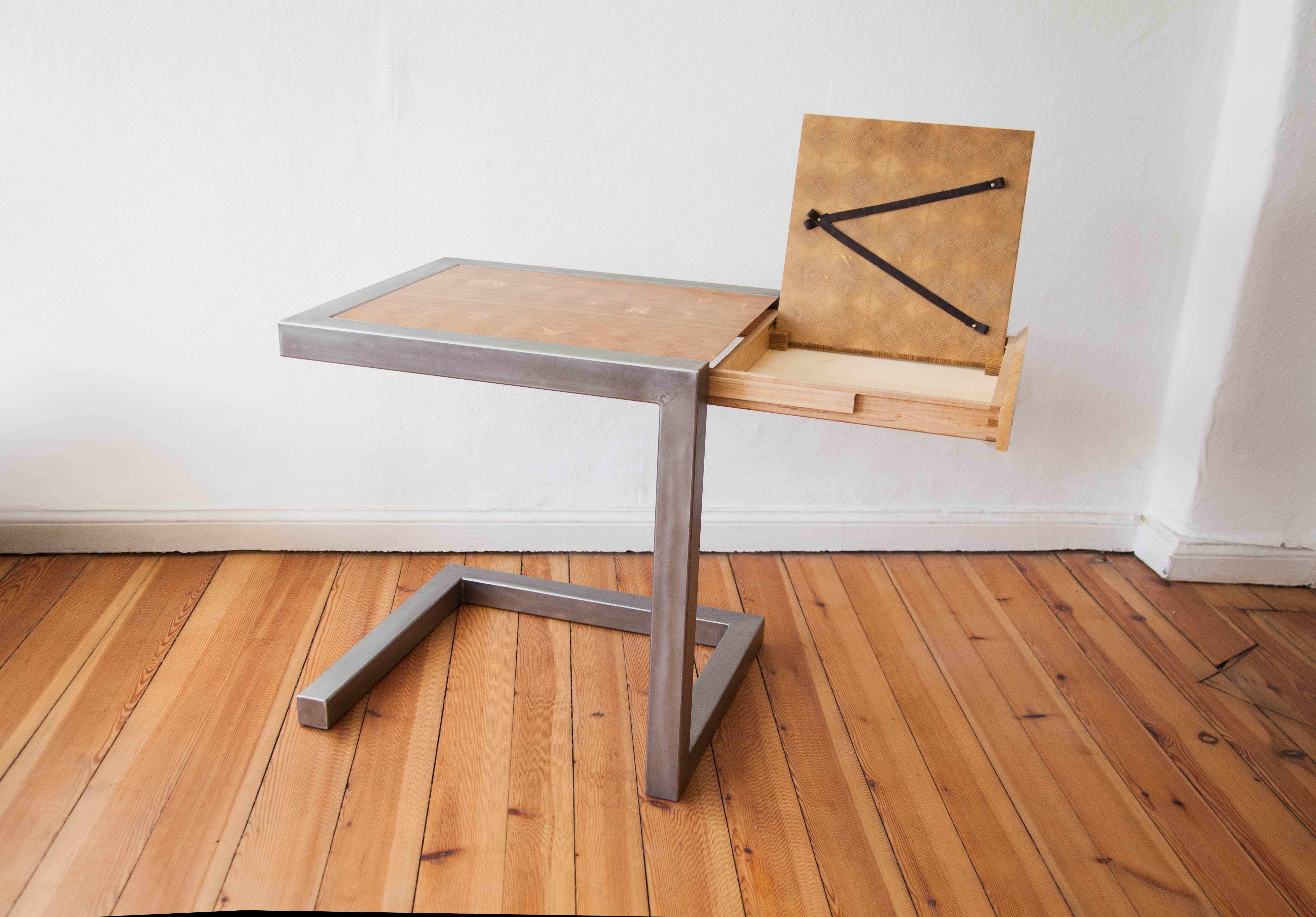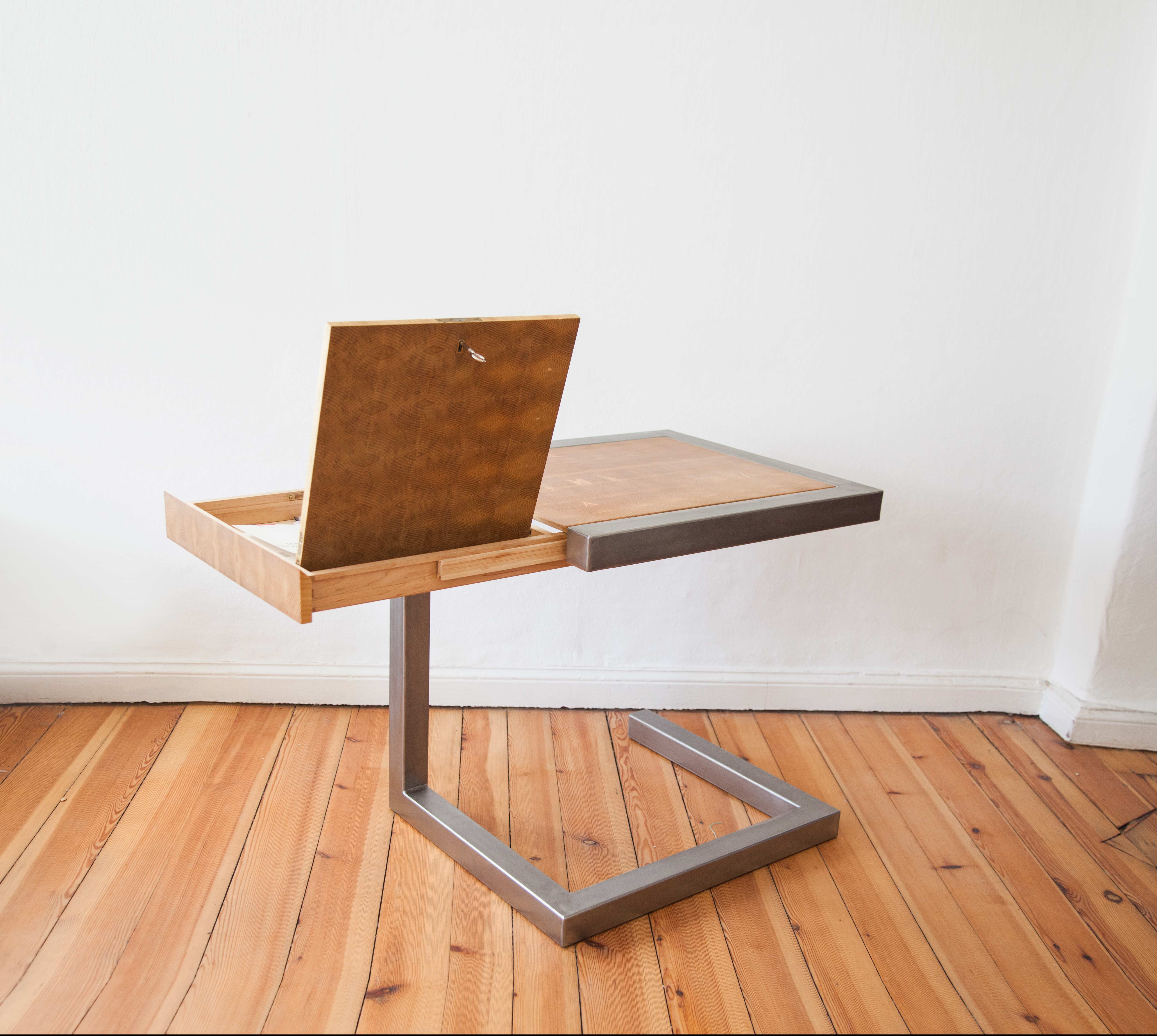 Freischwinger als kleines Home-Office Platzwunder. Mit einer Grundfläche von nur 0,42 qm im eingeklappten Zustand lässt sich der Sekretär auf nur einem Fuß unauffällig in den Raum integrieren, ohne nach Arbeit zu schreien. Der elegante Entwurf fand unter anderem in Wettbewerben und der Fachzeitschrift DDS Erwähnung.
