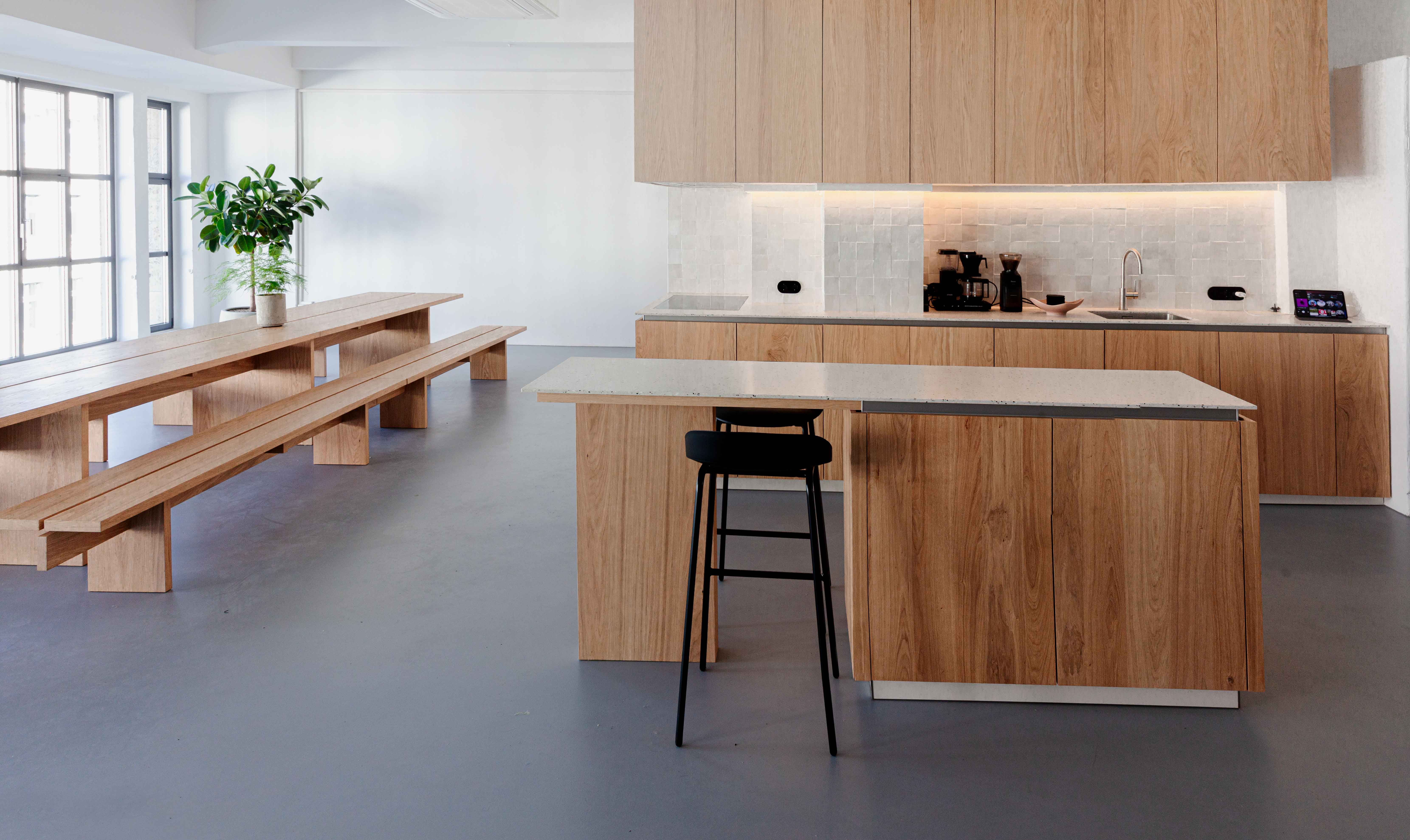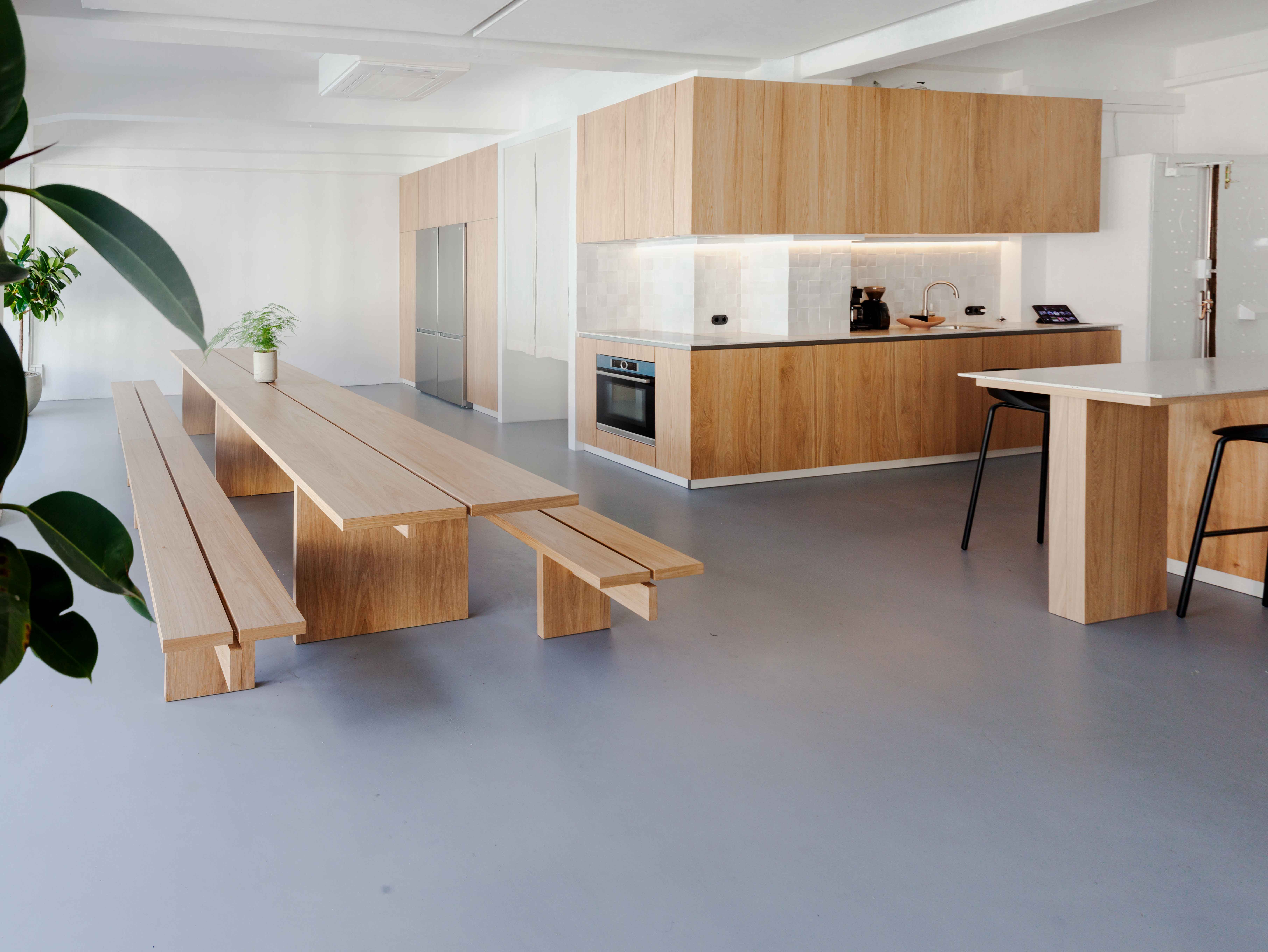 Zum Neubezug eines zweigeschossigen Loftbüros in Berlin Kreuzberg durften wir unter anderem die Mitarbeiterküche und eine lange Tafel mit Sitzbänken umsetzen.